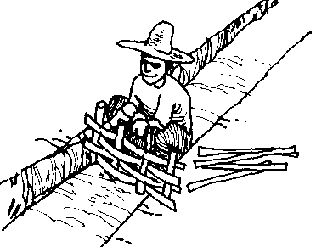 Weave split bamboo strips between the pegs and place bush or stones against the dam's upper side. Periodically, clean the area above the dam.