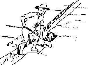 In the drainage system, drive stakes into the ground, perpendicular to the water flow. Gliricidia makes an ideal "live" peg if it is available. The cuttings will grow and form a permanent living barrier.