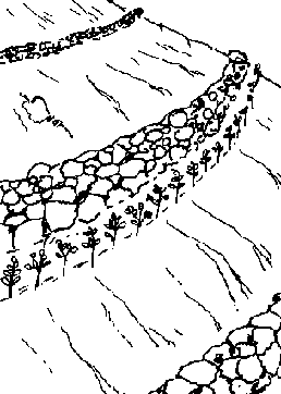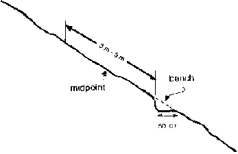 3. Bench terrace. Bench terraces can be dug at the hillside. The steeper the hillside' the smaller the terraces. It is recommended that the topsoil be removed first, the terraces constructed and then the topsoil placed evenly on the terrace. The riser should slope gently to reduce erosion. A contour canal is dug at the base of the riser and a small mound of soil is constructed at the edge of the terrace to prevent soil loss.