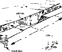 6. Soil trap. The purpose of this structure is to catch soil carried by water in a canal or gully. The pit should at least be 0.8 m deep × 1.0 m long × 0.5 m wide in a drainage canal. Clean the pit periodically and spread the soil on the farm Soil traps should be placed about 1 m above the dam.