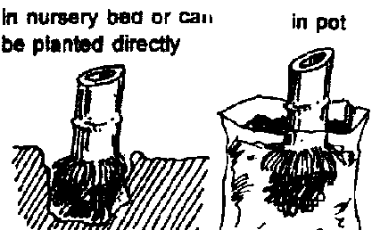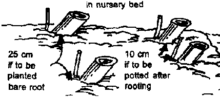 These one-node culm cuttings can be raised in containers or in nursery beds. Plant the cuttings in a slanting position with the branch stub at the upper side of the node. Plant the cuttings with a portion of the culm internode the branch node exposed. Ordinary garden soil or sandy loam soil is the preferred growing medium.