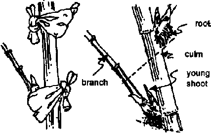 Fill marcot bag with moist sphagnum moss securely tied around the culm. Cover only the lower side of the branch base with sphagnum moss. After 15 days, when roots show through the moss, cut the culm and prepare onenode rooted culm cuttings. Rooted cuttings are planted in pots (plastic bags) with ordinary garden soil or sandy loam mixed with compost.
