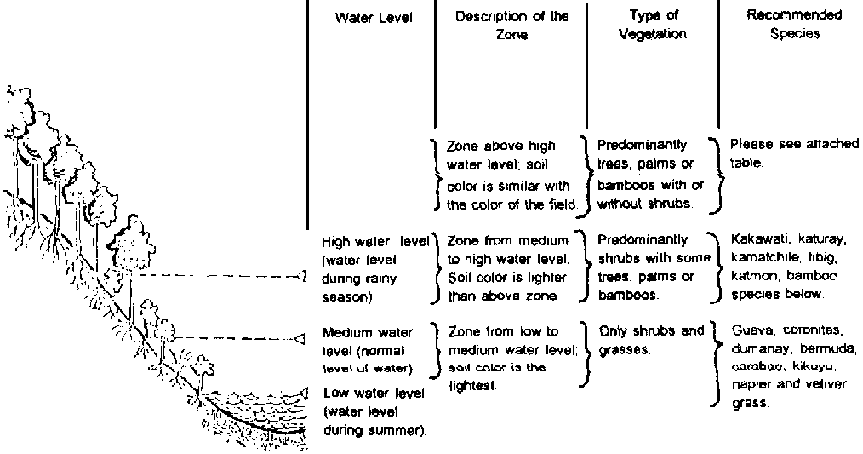1. In the zone from low to medium water level, only grasses and shrubs are allowed to be planted -the species that are able to survive prolonged inundation and are flexible enough not to break in the water current.2. In the zone from medium to high water level, some tree, palm or bamboo species can be planted with grasses and shrubs.