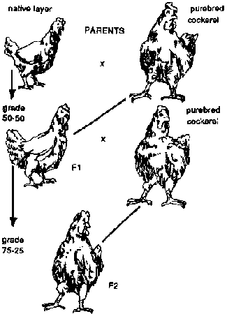 The offsprings of these are called mestizos or grades, whose size and egg production almost equal those of the purebred parents. Further mating of the graded females to purebred males produce birds that could be mistaken for purebreds.