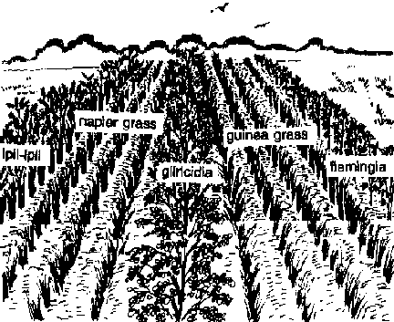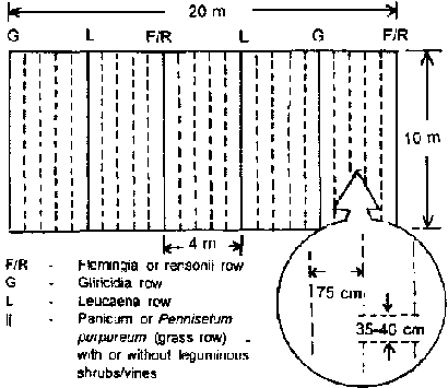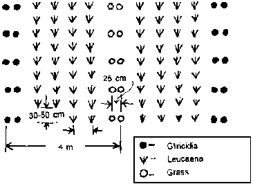 This modification is established solely with legume trees. The trees may be planted at interrow spacings of 1.0 m with 25 cm between hills. This should be cut on a 10-12 week cycle for optimum productivity, while grasses and leguminous shrubs/vines are mature for cutting in 6-8 weeks. More frequent cutting will reduce total productivity.