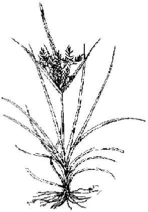 An example of a sedge-type weed. The main stems of sedges are triangular in shape. This particular type reproduces by seed as well as producing underground "nuts," which sprout into new plants.