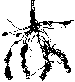 Root knot nematode galls on bean roots. Note how they differ from nodules by actually being part of the root.