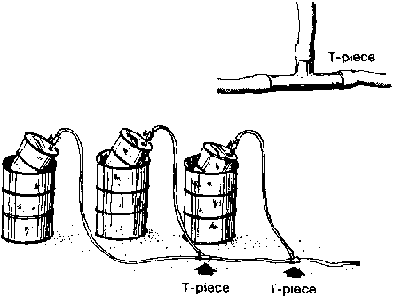 129. When you have several biogas units, you can connect them to your gas line by using T- pieces. The drawings show you a t- piece and how to connect several units to the same gas line.