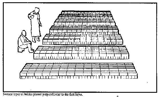 Beginning with the twelfth layer and for each subsequent layer, the bricks will be stepped in slightly to give the kiln a modified pyramid form This shape will increase the stability of the kiln and will prevent the kiln walls from collapsing outwards when the bricks shrink during the firing.
