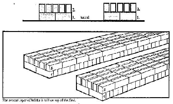 Place a row of bricks over the joint of the two bricks in the ninth layer which closed the roof of the tunnel.