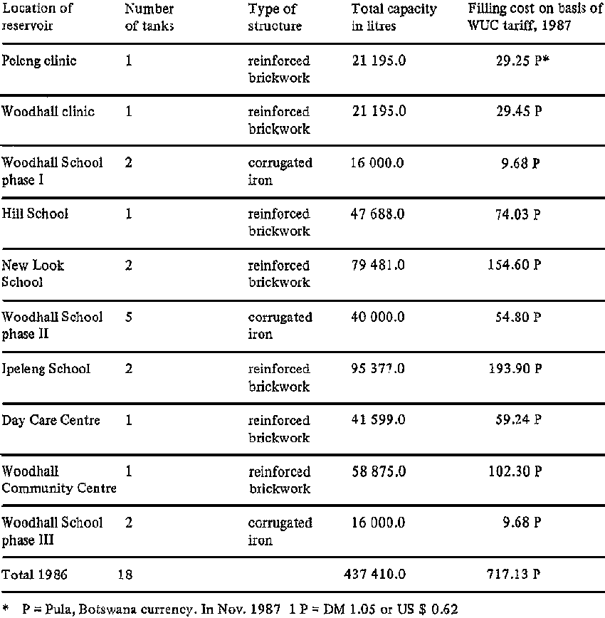 This resulted in the development of the dual system as it was then called. The dual system meant that rainwater reservoirs were built at the public buildings and always kept half filled with borehole water. When it rained the reservoirs filled up with rainwater, and when they became empty they were filled with two or four bowzerloads, depending on their size, and this could be timed properly. Early in 1986, all primary schools, the day care centre and the clinics were equipped with reservoirs and catchment systems. In addition a newly built community centre was equipped with a 59-m3 reservoir. Within three years and with only limited funds, an overall storage capacity of about 437 m³ was achieved (see Table 1).