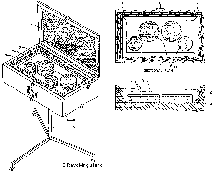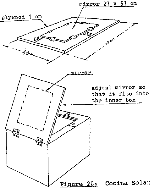 The specifications call for fiber glass-reinforced plastic, aluminum-sheet or wood construction. The basic shape is that of a square suitcase, the aperture dimensions amounting to 50 x 50 cm, the lid being fitted with a glass mirror (no reflecting foil) and the inner glass cover pane consisting of tempered (safety) glass. A simple support holds the cover open for introducing and removing food; a second support is provided for adjusting the reflector to the momentary solar altitude. The bottom of the case is fitted with rollers, and a handle is provided for carrying it. Some versions will accept a padlock to protect the food.