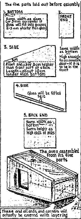 The double-pane glass cover is rigidly attached to the adobe structure (no tilting); the cooking space is accessible from the front, i.e. it corresponds roughly to a drawer. The inclined sheet metal walls of the inner box are made of tin on rice-rusk insulation. Thanks to its modular construction, the individual parts of the inner box can be extracted through the drawer opening without disturbing the glass-cover seal. In practice, this is sometimes necessary for cleaning, repainting, etc. The supporting masonry can be made of bricks or rocks and mortar, while the actual cooking box should consist of adobe clay, since the latter is a good insulator, thus contributing substantially to the box's good heat retention capacity. The cooker still works when individual clouds move past.