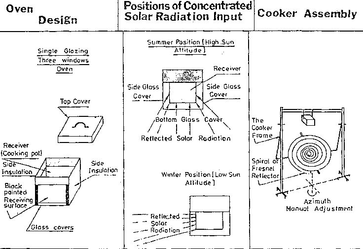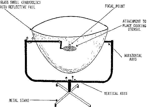 The cooker consists of 2 parabolic reflectors and a central unit with 2 glass windows of 0.6 m diameter. Reflected sunlight from the parabolics passes the windows and is reflected by two cured aluminum secondary reflectors to strike sides and bottom of the pot.