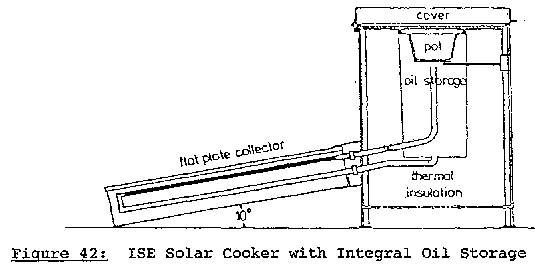 The hot plate requires the use of flat-bottomed pots (almost unknown in developing countries); since the pot is only heated from the bottom, the hot plate must develop a higher temperature than would be necessary in a cooking cavity or box-type solar cooker, and the size of the hot plate leads to substantial heat losses around the pot. Under such conditions, the collecting/storage capacity is relatively modest: the heat store can deliver about 1 kWh for the useful temperature range of 140...220ºC.