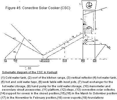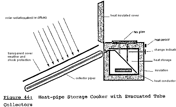 This solar cooker consists of a heat-storage block under a hot plate and lid, with an inclined bank of 6 evacuated collector pipes in a reflective tray with a transparent protective cover, all arranged as shown in figure 45.
