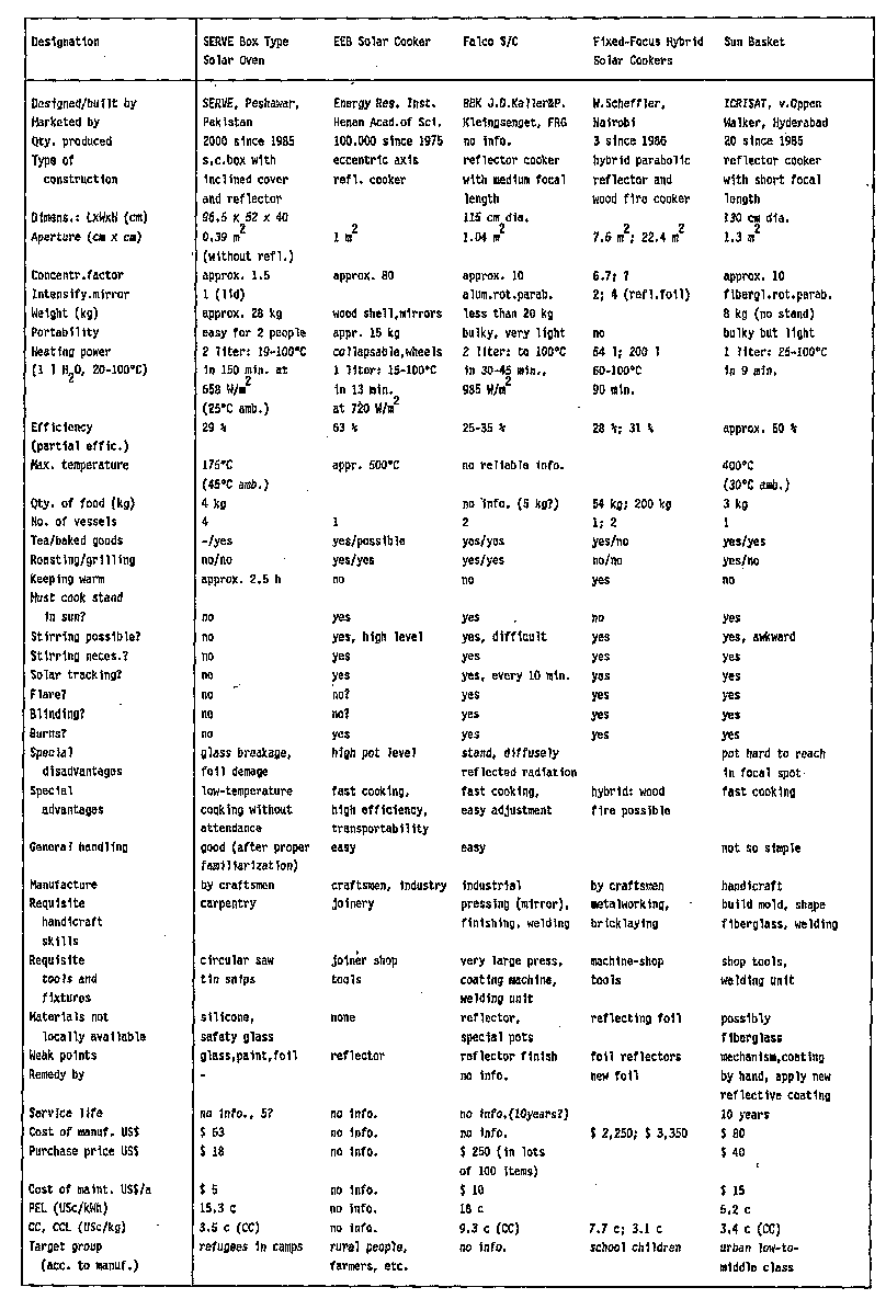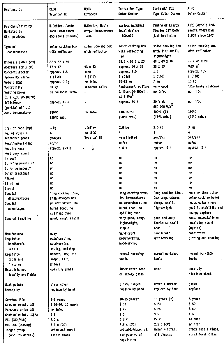 Various solar cookers that were devised in developing and industrialized countries for use in developing countries are described below. The individual illustrated descriptions precede a tabular summary comparison.