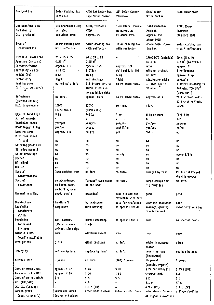 Most of the data listed in the table were taken from questionnaires that were filled out by individuals and institutions involved in the development and dissemination of solar cookers. A total of 92 individuals and institutions in 31 different countries were written to. Of the 46 replies received, 21 yielded data that could be included in the comparative survey included at the end of this appendix. The various individual solar cooker descriptions contain more such data. It should be noted that practically all such data is more or less subjective, i.e. not free of personal opinion. Some devices are described individually but not listed in the table, which may be taken as an indication of the questionnaire not having been answered properly, so that all or most of the data needed for tabular comparison were missing.