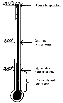 When a piece of wood is added to a fire, chemical changes occur in the presence of heat. At first, non-flammable carbon dioxide and water are given off. As the temperature increases, combustible gases and tars are also evolved. This process of chemical degradation in wood is called pyrolysis. When the temperature exceeds about 280 °C (Fig. 5-9), the proportion of flammable gases emitted is high enough to burn. Combustion will then occur only in the presence of oxygen, and at temperatures exceeding the ignition temperature of the fuel. (The average ignition temperature for the evolved gases in a wood fire is about 600 °C.) The gas is ignited by radiant heat from the already burning pieces of wood.