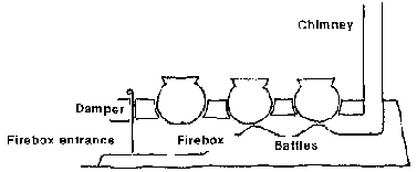 - Using the exhaust gases from the fire under the first pot in a multi-pot stove to heat subsequent pots (Fig. 5-17). Hot gases can be directed to the additional pots by a flue, or internal passageway. Hot, light gases rising in the chimney draw hot air through the stove.