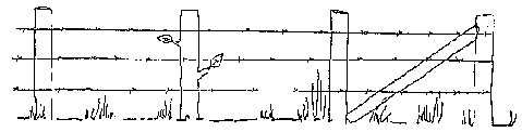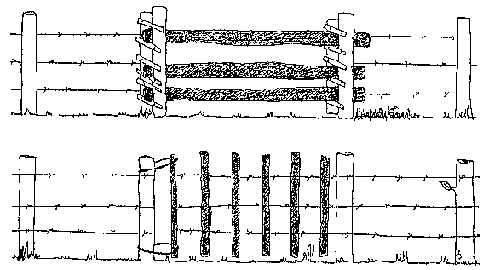Put the poles 3 to 4 meters apart. Use live poles if available. Plant cuttings of sunflowers or similar bushes along the fence. Reinforce the end or corners of the fence as shown.