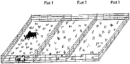 The oxen farmer cannot employ a permanent grazier. Instead he builds a fence around his grazing area. Fenced -in grazing land is called a "Paddock". The area of the paddock should be 2 HA for one pair of oxen. With good knowledge of supplementary feed, one hectare will be sufficient.
