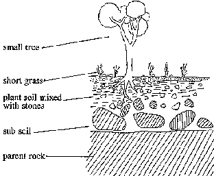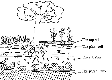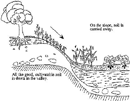 The soils along a slope typically vary in quality. On top of the hill, there are shallow layers of the top soil and of plant soil. In the steep parts of the slope. most of the cultivated soil has been washed away. At the foot of the hill, all the good soil is deposited. We find thick layers of top soil and plant soil.
