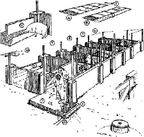 Pigs have a natural habit of defecating always in the same corner of their stable. Therefore, cleaning becomes easy if the dung areas of several stable boxes are inter-connected to form a corridor ( 1). The doors of the boxes are of the same width as the corridor (2). Normally the doors are open and divide the corridor into compartments belonging to the boxes (A). During cleaning of the stable, the doors are closed, leaving the corridor free (B). The floor of the stable slopes to the urine drain and the drain into the urine chamber (5). The dung chamber (4) is placed beside. A platform at the open end of the corridor is for easy transport of pigs (3). The stable consists of boxes for boar and sow for mating (6), weaning mother sows (7), older piglets (8), smaller pigs (9), and grown up pigs ready for slaughter (10). The troughs are each of appropriate size to the size of the pigs and are protected by a concrete apron to prevent pigs from laying into the fodder (11).