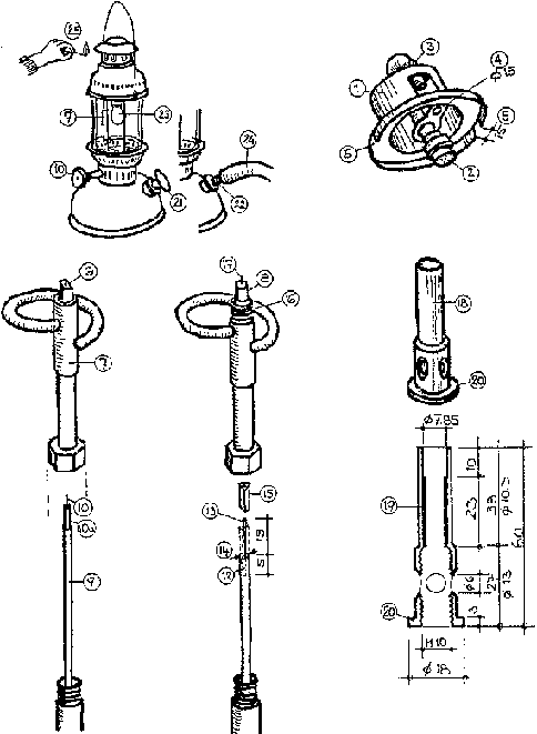 The new mixing pipe (18) is made from Ø 18 mm brass rod. The lower part is turned to Ø 13 mm with an inner thread of M10·1. Four air holes of 0 6 mm cross the pipe. Their rims are bevelled. The upper part is turned to Ø 10.3 mm outside and 7.85 mm inside, where a stainless steel pipe (19) of Ø 8 mm outside and Ø 6 mm inside is pressed in. At the lower end of the mixing pipe there is a 3 mm flange to prevent uncontrolled air supply to the flame (20). After screwing the mixing pipe to the standpipe the inner parts are modified.