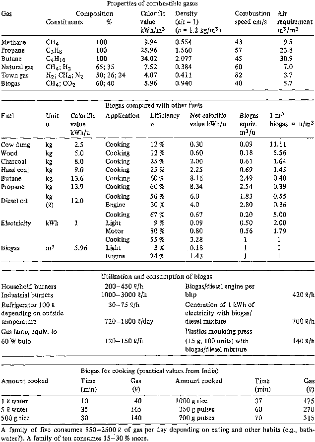Biogas can be used in the same way as any other combustible gas. When biogas is mixed with air in the proportions of 1:20, highly explosive detonating gas forms. Leaky gas pipes in enclosed spaces constitute a hazard! However, there have been no reports of dangerous explosions caused by biogas. The calorific value of biogas is about 6 kWh/m³ - this corresponds to about half a litre of diesel oil. The net calorific value depends on the efficiency of the burners or appliances (see Table, Figure 38).