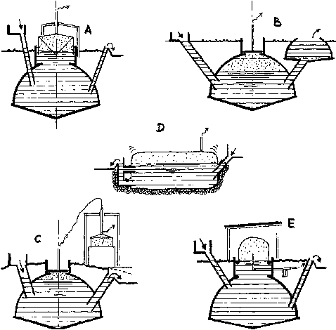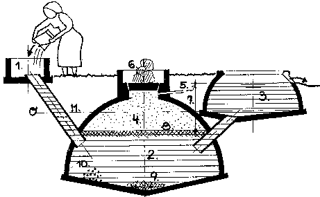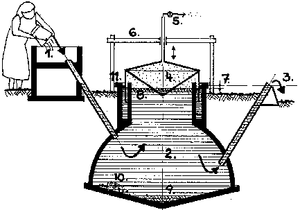 tank with inlet pipe. 2. Digester. 3. Overflow on outlet pipe. 4. Gasholder with