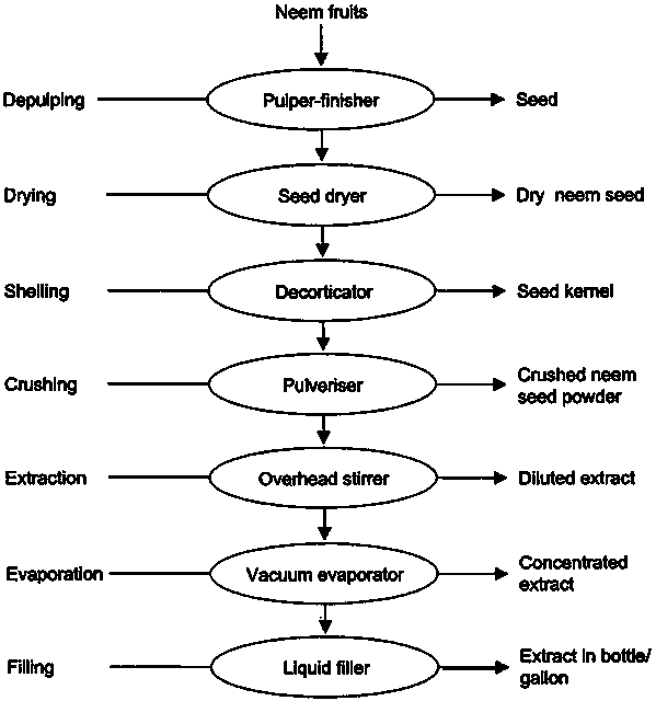 Figure 1 is a schematic diagram of a production line using a single-step extraction method for producing commercial neem-based formulations. This technology is used in Thailand, Myanmar and Kenya: