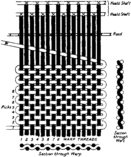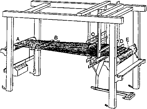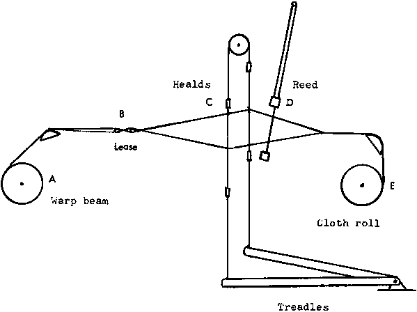 A simple frame hand-loom is illustrated in Figure III.2, while Figure III.3 shows the corresponding loom elements at the time of weft insertion. A similar side-view of a power-loom is shown in Figure III.4.