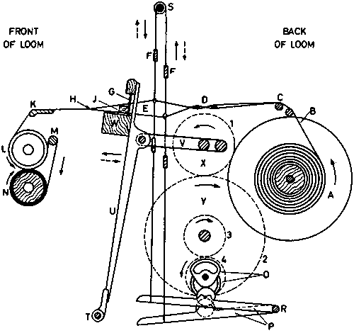 Automatic shuttle looms are essentially simple power looms to which has been added means of automatic weft replenishment. However, in order to gain full advantage of this latter feature, thus enabling a weaver to look after more looms, shuttle looms should also be equipped with an automatic warp let-off motion and an automatic warp-stop motion (which immediately stops the looms if a warp thread break occurs). All these features are considered standard fitments on an automatic loom. Figure III.9 shows an automatic Pirn change loom with under-pick motion.