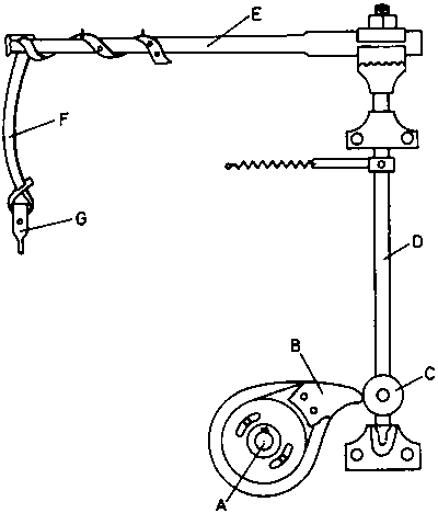 It will be appreciated that cams, unless of the positive motion types only impart movement to the cam follower in one direction. It is thus necessary to provide means for reversing the direction of motion in order to obtain continuity of the action. Simple stepped rollers placed above the loom, and over which straps are passed which are coupled to the tops of the heald staves, are used for reversing the two staves required for plain-weave (see Fig. III.5). For weaves woven by means of tappets which require more than two staves, more complex multiple roller reversing motions can be fitted to the Lancashire loom or, alternatively, spring-operated reversing motions, of which there are a number of designs, can be used.