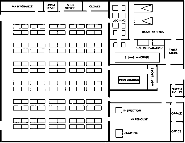 Figure III.10 is provided as a guide for the space requirements and layout of a small-scale weaving factory. The layout may be scaled-up for larger undertakings by using the data in Tables IV.3 to IV.5 in chapter IV.
