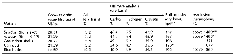 The fuel properties of sawdust, groundnut shells, coir dust and rice husks were investigated; a summary of results is given in Table 1.