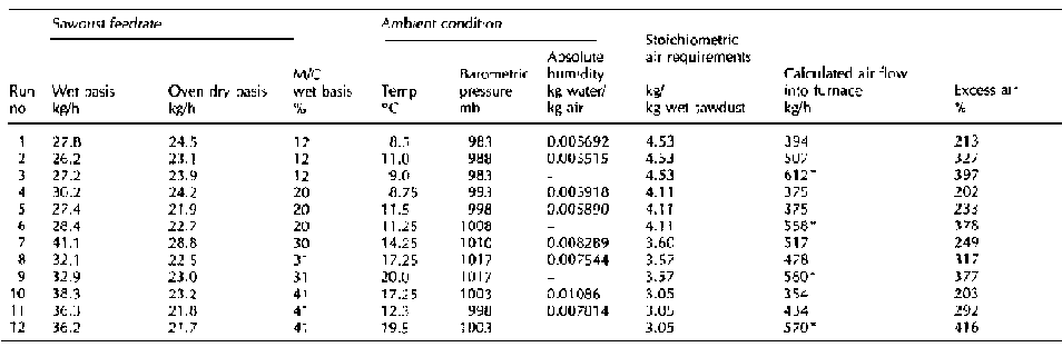 A series of trials with groundnut shells at a 15% moisture content (as received) were conducted at various feed rates and excess air values. Steady-state conditions were achieved at operating conditions similar to those found with sawdust at 12% moisture content. However, in all trials a blue-coloured haze was observed in the exhaust emission. This condition was considered to be associated with incomplete combustion. Unsuccessful attempts to improve this condition included operating at an elevated furnace temperature, and reducing the particle size of the groundnut shell by passing it through a 4 mm-square mesh hammermill.