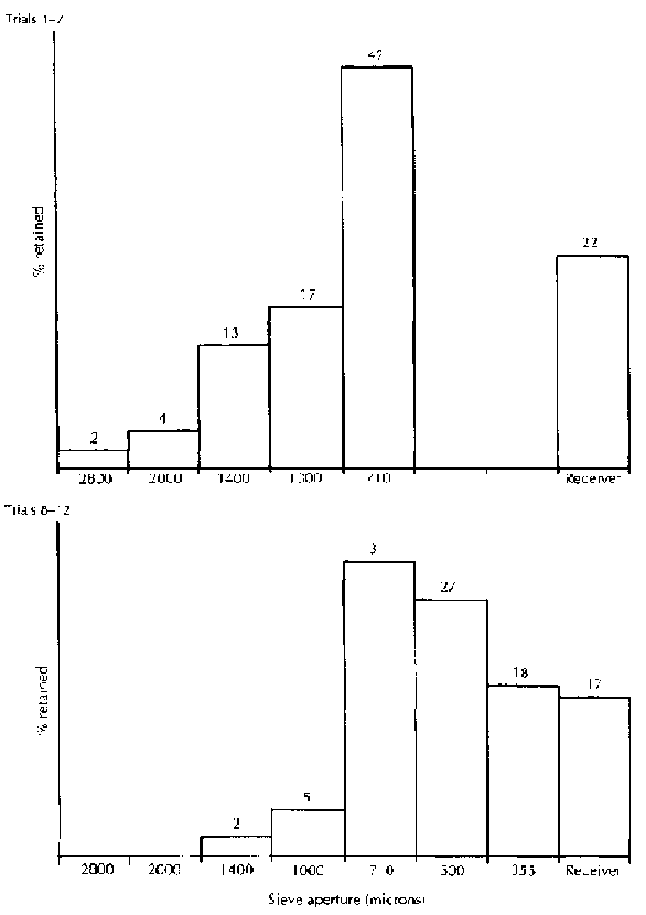 At a nominal feedrate of 25 kg/in (oven-dry basis) 3 trials each were carried out at nominal moisture contents of 12% (as received), 20%, 30%, and 40%, with nominal excess air values of 300%, 400% and 500%. Trials with sawdust at 50% moisture content were also conducted. For reference, an analysis of the sawdust particle size distribution was made and the results are shown in Figure 4.