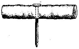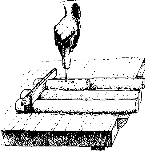 Use a drill to make a hole in the center of a piece of wood. Choose a drill which will make a hole that is slightly smaller than the nail that will fit into it. Drill the hole almost through the other side of the wood. Diagram A shows the wood supported by a bench hook while being drilled. Then hammer the nail through the hole until the head of the nail reaches the wood. The best place to do this is on soft ground from which the nail, attached now to the wood, can easily be removed.