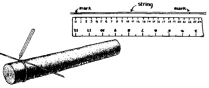 To measure the circumference of the wood, wrap a piece of string around the wood as shown and mark the string. The measure the distance between the marks. This distance should be between 21 cm and 23 cm.