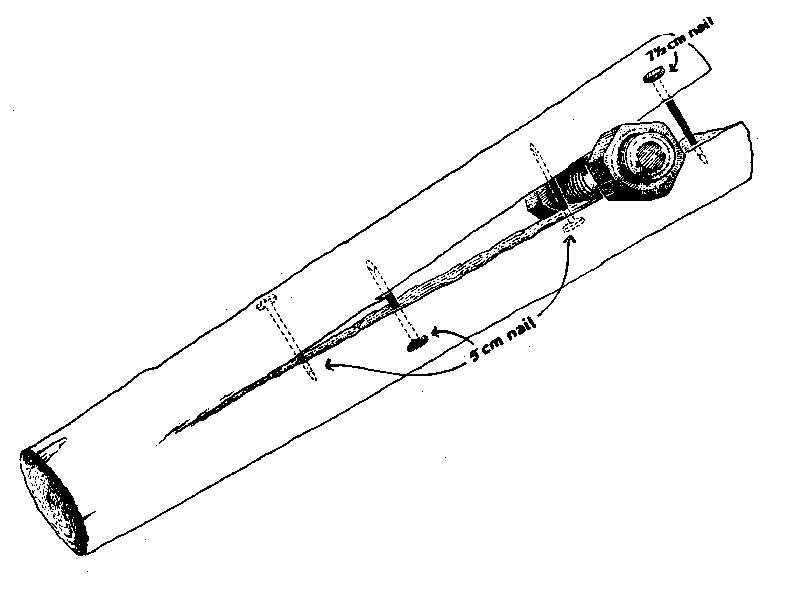 To keep the bolt in place and the wood from splitting further, you will need to hammer a few nails as shown in the diagram. A heavy stone can be used to drive in the nails.