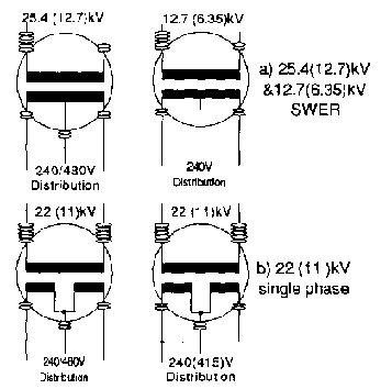 Transformers would follow US rather than European practice. They could be rated at 16 kVA for single phase 22 (11)kV (concept a & b in Fig 1). For SWER lines it would be convenient to use ratings of 5 kVA for 12.7 (6.35)kV and 10 kVA for 25.4 (12.7)kV (concept c & d in Fig 1 ) with one standard dual voltage transformer with only one high tension bushing. The high voltage winding can be connected to either 25.4 (12.7) or 12.7 (6.35)kV. The dual secondary winding can be connected in series for 240 & 480V at 25.4 (12.7)kV. At 12.7 (6.35)kV, however, only the 480V winding is used (see Fig 4a), which will produce 240V.