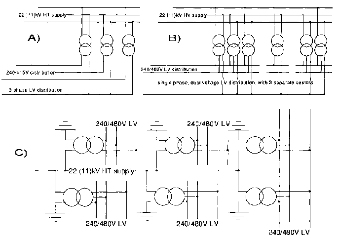 The essential elements of the system are shown in Fig 1. All the voltages are shown for a 22 kV main distribution (and in brackets an 11 kV).