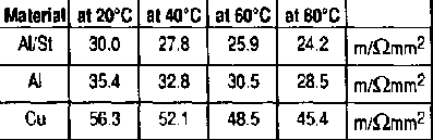 Commonly copper and aluminium conductors are used. Here aluminium ropes (conductors) are emphasized: for the same current the per length weight is only half and aluminum is cheaper. Furthermore, aluminium ropes with a steel core, ACSR (Aluminum Conductor, Steel Reinforced), have approximately the same tensile strength as copper wires.