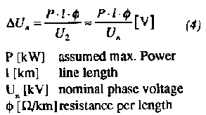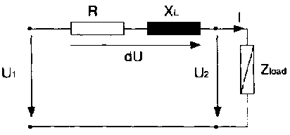 The line is described in the equivalent circuit by a resistor and an inductance. Above 60 kV the capacitance between the wires as well as between wires and ground have to be considered. With a current I along the line a voltage drop occurs. At the line's end only a reduced voltage U2 = U1 - DU is available. The phase shift f between U, and U2 is small for short lines and the exact complex calculations can be avoided. A calculation using real values is introduced.