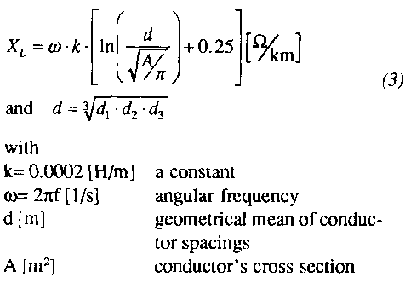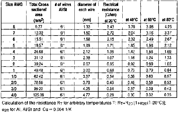 The cross section A is difficult to calculate if XL is not zero and is therefore tabulated. Table 3 shows vertically arranged ('racked') wires equally spaced at a distance of 0.25 m.