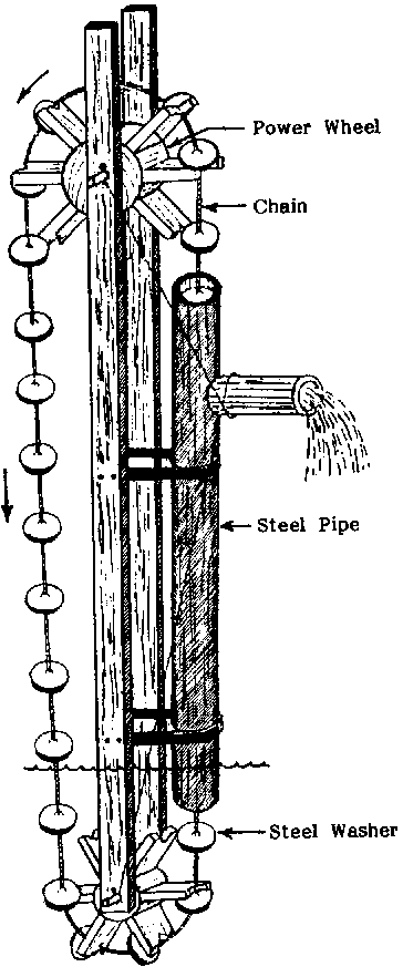 (b) The round-steel-washer chain pump (figure 6) is used in conjunction with human and animal power and consists of a continuous steel chain upon which are mounted steel discs with rubber or leather washers. The chain passes around an upper gear wheel, down the well, under the water source, around and then up into the bottom of a pipe with inner diameter the same as the washers. Water is lifted up within the pipe and expelled at the top. A square wooden adaptation of this pump is shown in figure 7.