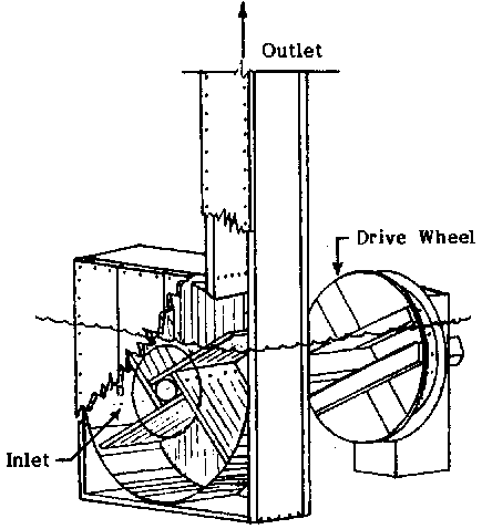 (d) Axial-flow pumps have good potential for low-lift pumping because. of their relatively simple construction and high efficiency. No use of these pumps with wind rotors is recorded, but it has been suggested that axial-flow pumps would be appropriate for high-volume pumping of sewage wastes in oxidation ponds. Theoretical studies of wind-powered axial-flow pumps are being carried out at the National Aeronautical Laboratory in India.