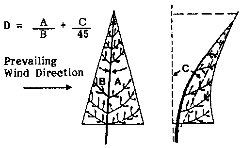 Another good indicator of relative wind speeds is the deformation ratio (Hewson, Wade and Baker, 1977). It also measures how much the tree crown has been flagged and thrown. Figure 2 shows the tree angles, A, B. and C, that must be measured to compute the deformation ratio "D". To measure these angles, the trees can either be photographed or sketched to scale. (The user might sketch the tree on clear acetate while he looks at it through the acetate.)